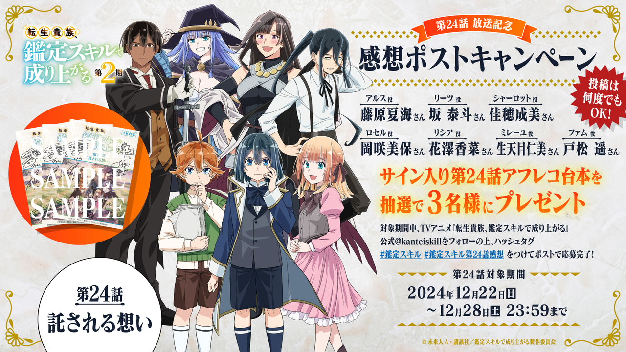 | 『転生貴族、鑑定スキルで成り上がる』アニメ続編第3期が制作決定!キャスト陣は何故かザコシショウから伝えられる …いて ―― 『転生貴族、鑑定スキルで成り上がる』作品基本情報TVアニメ『転生貴族、鑑定スキルで成り上がる』は、未来人Aの小説『転生貴族、鑑定スキルで… (出典:) |